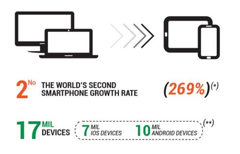 该地区智能手机增长率达269%,成为全球智能手机增长率第二的国家。该地区1700万智能设备中,有700万的iOS设备,1000万安卓设备。越南的移动游戏中90%都是具有IAP的免费游戏,而在越南游戏中广告、付费下载、订阅付费都难以获得成功。