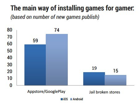 GooglePlay渠道下载量仍高于Appstore,但是就越狱渠道而言,iOS渠道下载量稍微高于安卓渠道。