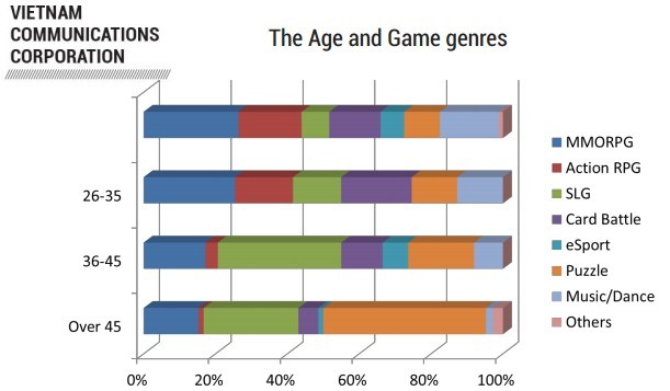 越南总人口9151.9万,互联网用户渗透率达34%,达3085.9万人。城市人口占31%,乡村人口占69%。移动电话渗透率高达139%,达1.27亿台。另外越南玩家人口组成较为特别,1700万玩家中,54%都为30岁以下。玩家人口分布图如下:10-20岁人口占比21%,20-35岁人口占比49%,35-50岁人口占比28%,50岁以上人口占比2%。男女比例分别为56%和44%。其中移动玩家中,平板玩家占8%,智能手机占92%。