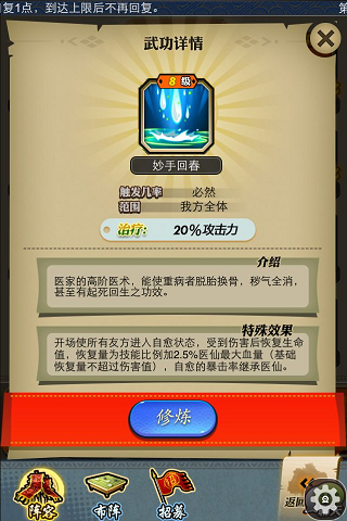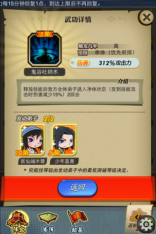 再来说说他与医仙的合体技能“鬼谷吐纳术”。触发几率:高。范围:单体优先前排。伤害:0 250伤害百分比。特效:释放技能后我方全体弟子进入净体状态(受到技能攻击时伤害减少15%)两回合。