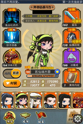 说到合体技,再来说一下医仙。自从上次更新修缮了医仙的技能之后,她的生存意义大大增加。此前,医仙是作为一位必不可少的炮灰上阵的,但现在情况不同。技能的修改和合体技的推出让医仙对于全队的意义稍减,但让自身的价值猛增。从今以后医仙的妙手回春也只是为全体规划了一个与敌方挂钩的回血上限,碰到弱的难伤我分毫,却再不会是越打越强。作为能够秒人的合体技的触发保证,她越发的多样化了。是不是培养的时候应该多分配一些血量给她?或者是适量增加她的速度以求合体技的保证?这些都是此后需要考虑的问题。