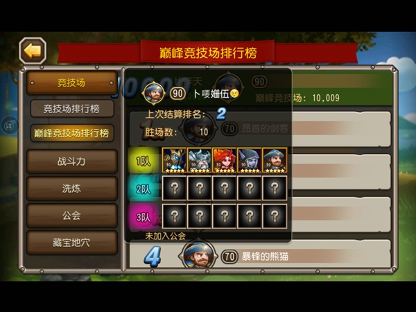 在巅峰竞技场中,玩家可以选择三队英雄进行防守和进攻,自动战斗,三局两胜。为了中和进攻方的主动优势,会对部分玩家的防守阵容进行一定的隐藏。前500名玩家隐藏第三队防守阵容,50名以内的玩家额外隐藏第2队防守阵容,第1名的玩家隐藏所有防守阵容。