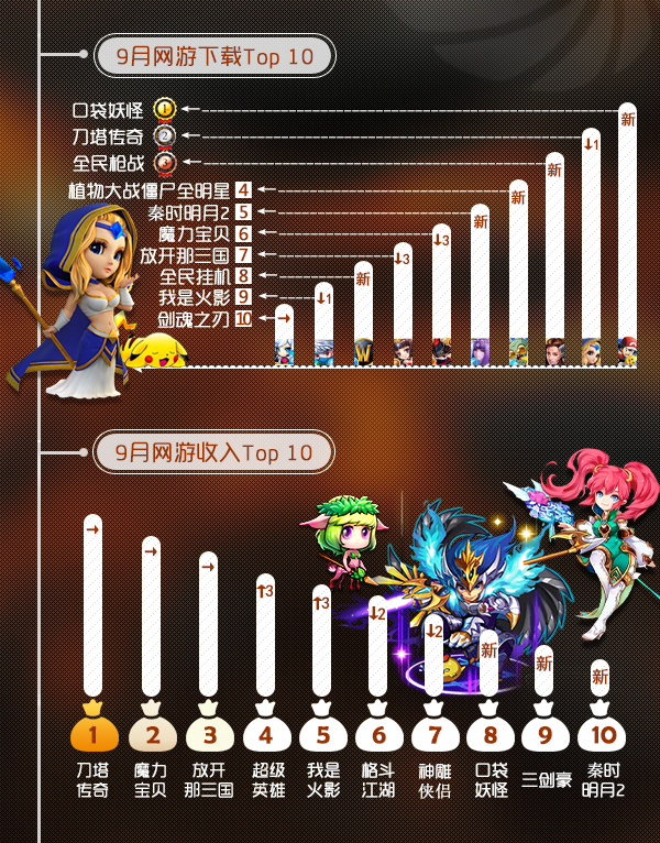 网游收入方面,《刀塔传奇》、《魔力宝贝》、《放开那三国》仍然集体占据着收入榜单三甲,席位顺序和8月相同。而榜单4-7名也比照8月榜单未有明显变化,仅排名略有调整。从整体收入比例来看,卡牌、RPG、动作这老牌3强的地位仍未变化。