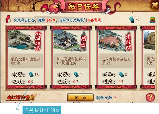 上方的”N“指代掌门当前能参与的各种任务进度。