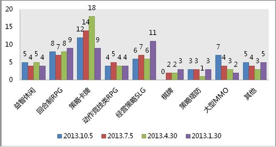 从图中可以看出,2013Q1~Q4,随着硬件设备与引擎技术提升,CP研发实力增强,端游巨头介入以及市场需求导致重度MMO类手游增长数量明显增加。