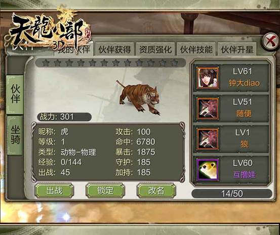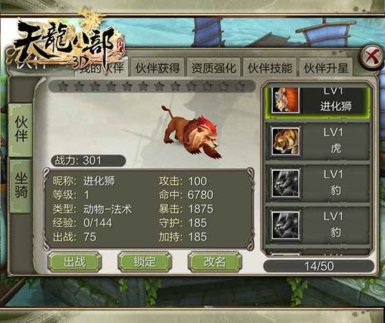 《天龙八部3D》伙伴系统彻底改变了这种情况,还动物野性,狮吼虎啸惊天变,狡诈如狐闪电貂,神武英俊双麒麟,日行百里汗血马。游戏中的伙伴系统让玩家真正的拥有猛兽,动物园中的狮子老虎早已没有了“牙齿”,但是游戏中凶猛异常的狮虎一定会让玩家想到它们在野外的样子。