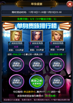 现在,单身贵族排行榜活动正在火热进行中,想要在三百万挂友中寻找那个Ta吗?快来参加活动,成为高高在上的贵族头衔吧!只要每天接受漩涡收集任务,不仅有机会将自己进阶成为贵族,还能得到相当丰厚的精华、宝石袋、金币、声望奖励哦!