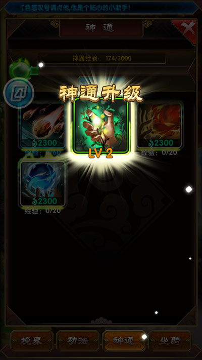 打怪可获得神通经验,在神通界面可将神通经验分配给神通,当满足条件时则神通升级。