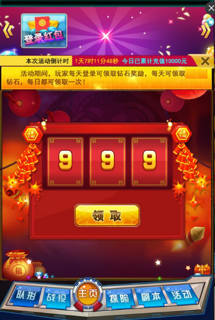 活动期间每日登录即可领取随机钻石。每日限领取1次。